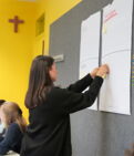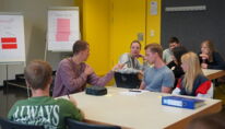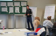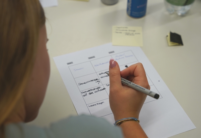 Ein zentraler Bestandteil des Tages war die gemeinsame Themenentwicklung. Mit kreativen Methoden wie beispielsweise Brainstorming mithilfe von Post-its erarbeiteten die acht Projektgruppen jeweils einen Themenpool. Im Anschluss stellte jede Gruppe ihr favorisiertes Thema in einem Pitch vor. In kurzen Fragerunden erhielten die Gruppen direktes Feedback, das ihnen bei der Schärfung und Konkretisierung ihrer Themen in den nächsten Wochen helfen wird.