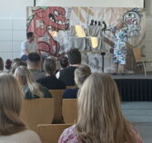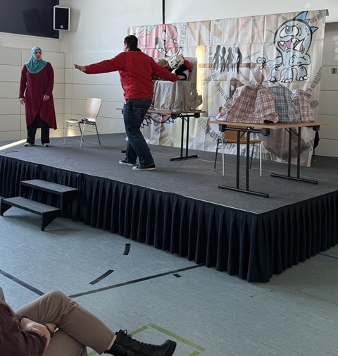 Im Anschluss an die ca. einstündige Aufführung traten die beiden Schauspieler aus ihren Rollen heraus und führten eine Gesprächs- und Fragerunde mit den Schülerinnen und Schülern. Gemeinsam wurde dabei herausgestellt und betont, wie junge Menschen im Spiegel unterschiedlicher sozialer und kultureller Herkunft oftmals miteinander umgehen. Dabei erkennen die Schülerinnen und Schüler, wie wichtig es in ihrem/unserem Alltag ist, mit Achtung, Toleranz, Selbstvertrauen und auch Offenheit unserem Gegenüber zu begegnen. Das Fazit der Gesprächsrunde macht deutlich, dass unser Zusammenleben, egal welche sozialen oder kulturellen Unterschiede vorherrschen, stets eine Begegnung auf Augenhöhe sein soll.