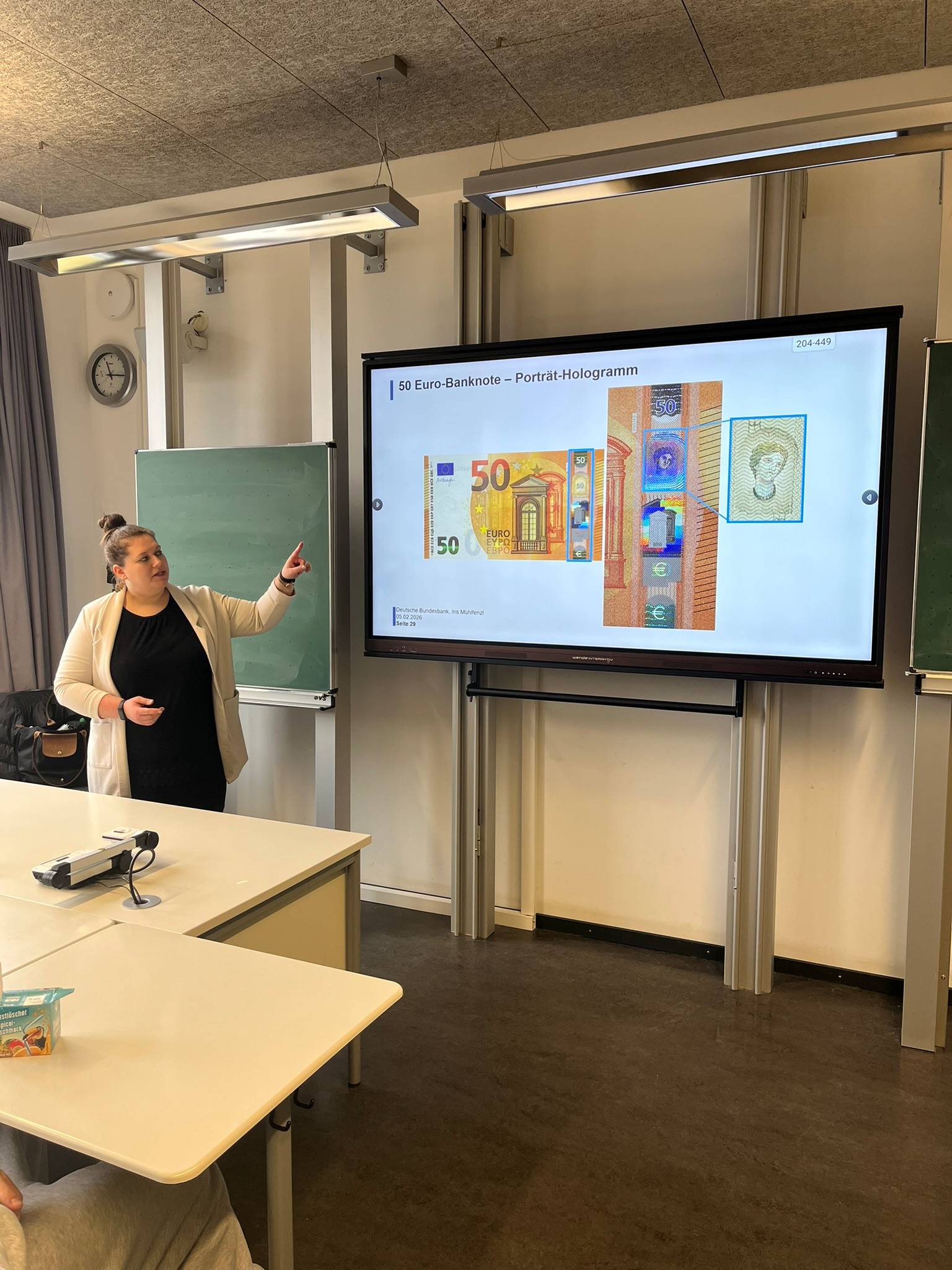 Die Schüler erhielten umfassende Informationen zu den Merkmalen von Banknoten sowie zu den unterschiedlichen Arten von Fälschungen. In einem praxisnahen Ansatz erläuterte Frau Mühlfenzl die sechs wesentlichen Prüfkriterien für große und kleine Scheine, wobei sowohl die alte als auch die neue Serie der Euro-Banknoten berücksichtigt wurde.